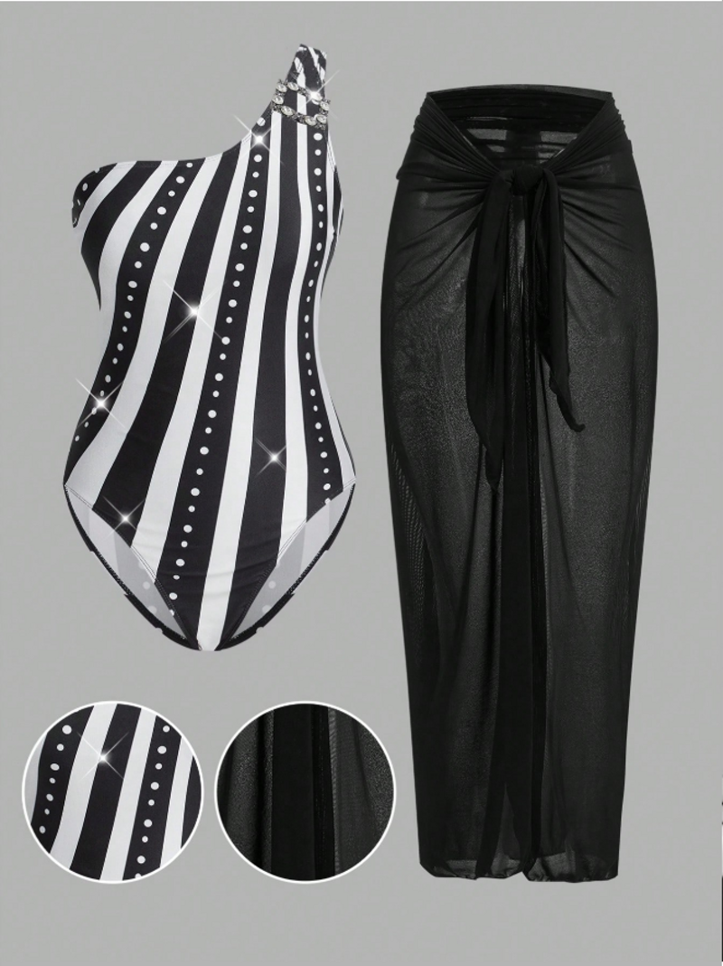 LUXURY MOD. TWIGA BLACK & WHITE RIGHE COSTUME INTERO CON PAREO. FIBBIA GIOIELLO TAGLIA S